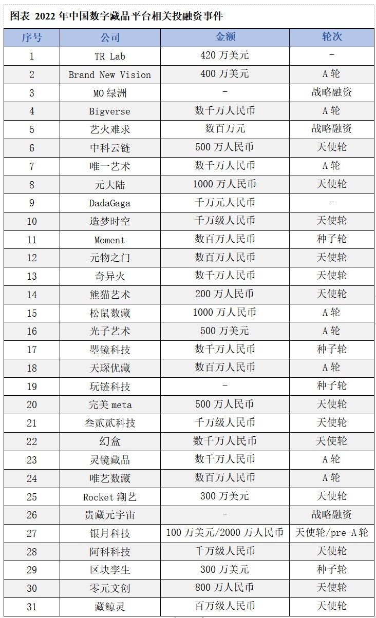 整个2022年,从“融资事件数量”和“金额”来看,资本对数字藏品还是具有一定的热情。梳理去年获得投资的相关公司,总计达到31家,其中有3家获得不止一次的投资。除此之外,从这些事件的“融资金额”来看,虽然超过一半的公司获得千万级别的投资,但也有超过10家公司获得百万级别投资,这个占比是去年元宇宙投融资整体百万级别投资的6成。